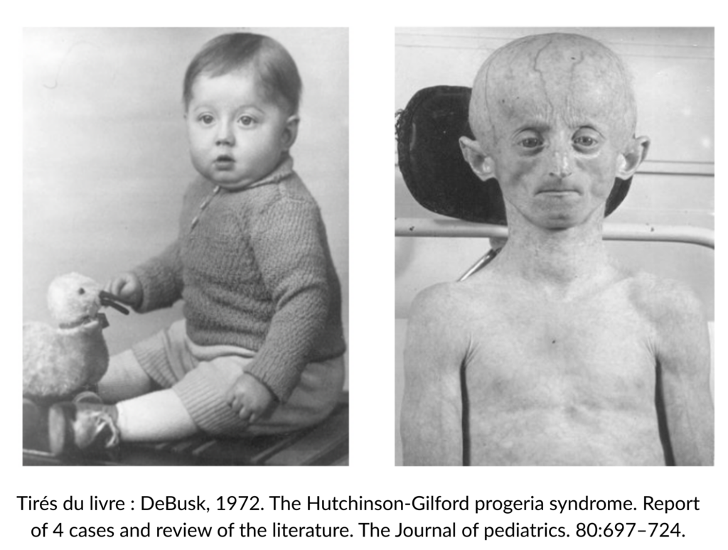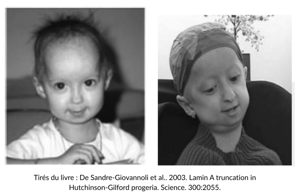 La Progeria est causée par une mutation du gène LMNA, qui entraîne la production d’une protéine toxique nommée progérine.